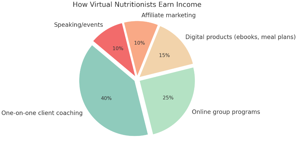 Virtual nutritionists charge anywhere from $75–$200 per session, depending on experience. Group coaching, online programs, affiliate income, and digital product sales can multiply income streams.